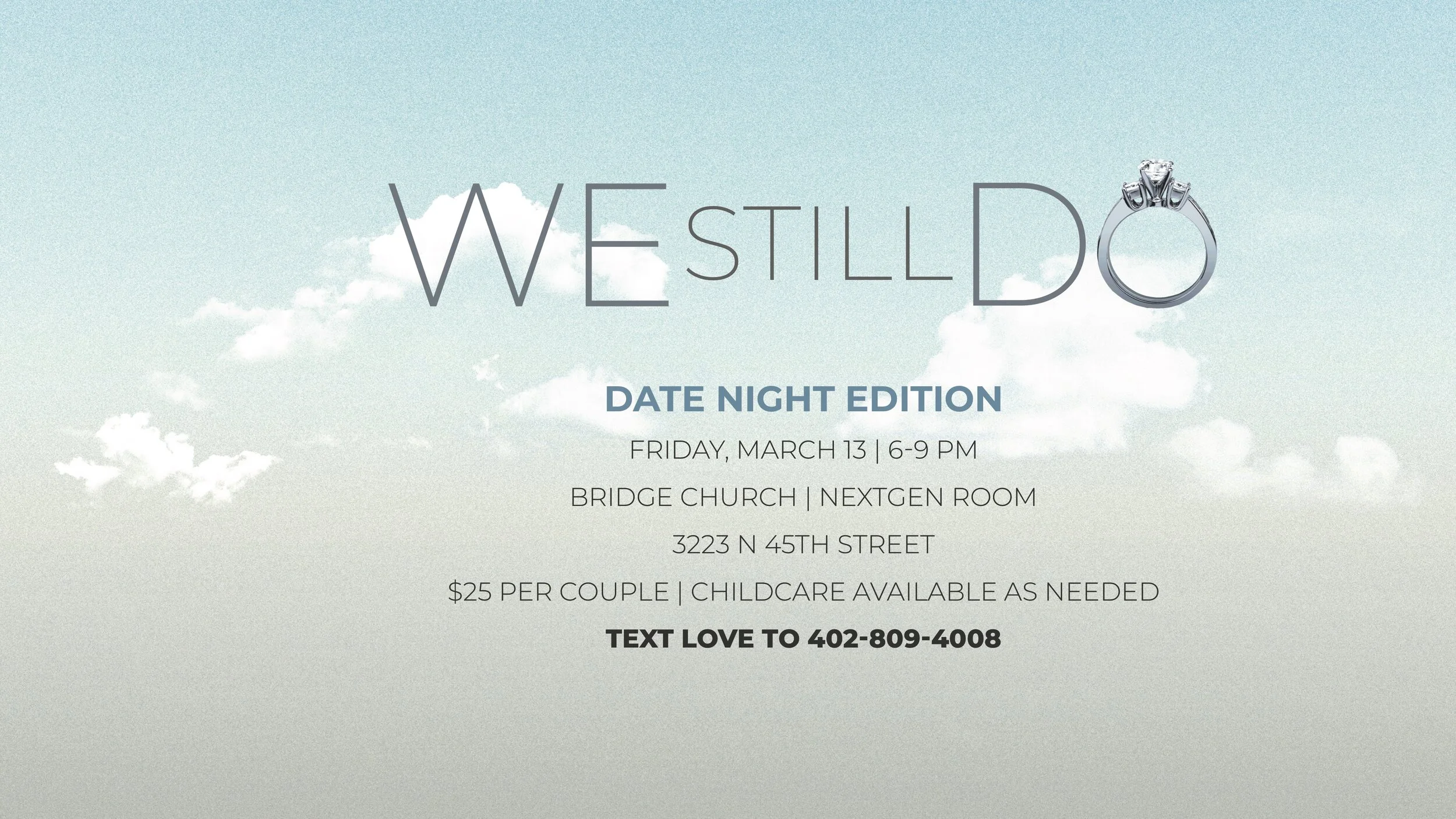 DATE NIGHT WILL BE POSTPONED UNTIL FURTHER NOTICE due the coronavirus (COVID-19). While this type of gathering invites physical contact, we are pushing pause to assure you that public health and your safety are the most important to us, Please keep your eye out for a reschedule date, along with resources to continue to empower married couples.
